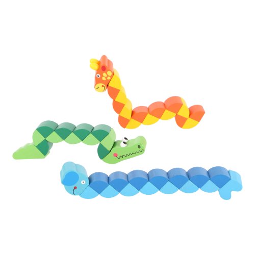 S týmito zvieratkami zažijú Vaše deti pravú divočinu! Články ich tiel môžu rozpustilo otáčať a klikatiť, pritom zábavnou formou cvičiť zručnosť a sústredenie. Každý z variantov je vyvedený v inej, pútavej farbe, ktorú spestrí a rozveselí stolík, či poličku v detskej izbičke. Telo hračky je vyrobené z odolného dreva spojeného gumičkou a vďaka svojej veľkosti môže deti ľahko sprevádzať na cestách. Hlavné vlastnosti:3 rôzne variantyatraktívne a odolné drevené spracovanie