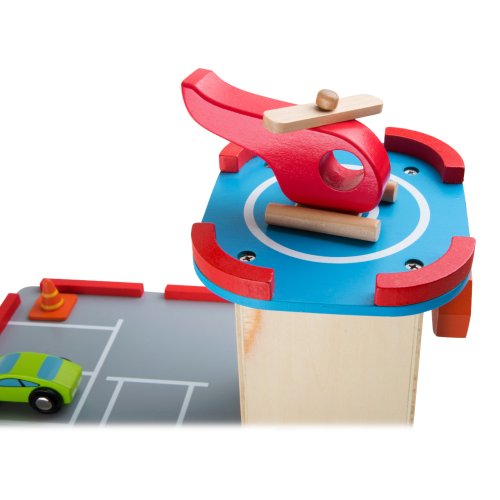 Zábava na troch podlažiach! Výťah vyvezie autá do požadovaného poschodia, heliport má dosť miesta na hladké pristátie helikoptéry, na prízemí môžu autá natankovať. Množstvo značiek pomáha s riadením dopravy. Súčasťou sú 2 autá, vrtuľník, 4 dopravné značky a 3 dopravné kužele, benzínová pumpa a závora. Odteraz bude v detskej izbe naozaj veľká prevádzka. Hlavné vlastnosti: 3 podlažia prepojené funkčným výťahom a 2 rampami12 ks príslušenstvoodolné drevené prevedenie