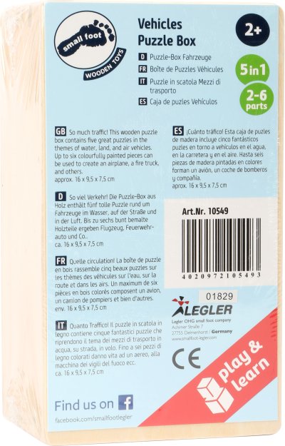 Obrysové puzzle s motívmi dopravných strojov pre najmenšie deti! Puzzle sú balené v drevenej krabičke s vysúvacím viečkom, na ktorom sú znázornené jednotlivé dopravné prostriedky. Balenie obsahuje celkom päť puzzle obrázkov s rôznym počtom dielikov. Dieliky sú robustné a teda vhodné pre malé prstíky a prvé skladanie. Skladanie podporuje rozvoj fantázie a má priaznivý vplyv na jemnú motoriku. Vhodné pre deti od 2 rokov.