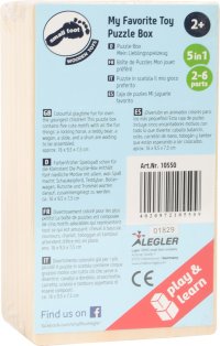 Obrysové puzzle s motívmi obľúbených detských hračiek pre najmenšie deti! Puzzle sú balené v drevenej krabičke s vysúvacím viečkom, na ktorom sú znázornené jednotlivé hračky. Balenie obsahuje celkom päť puzzle obrázkov s rôznym počtom dielikov. Dieliky sú robustné a teda vhodné pre malé prstíky a prvé skladanie. Skladanie podporuje rozvoj fantázie a má priaznivý vplyv na jemnú motoriku. Vhodné pre deti od 2 rokov.