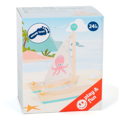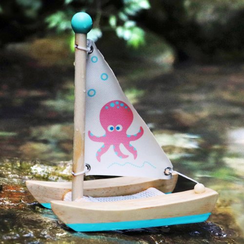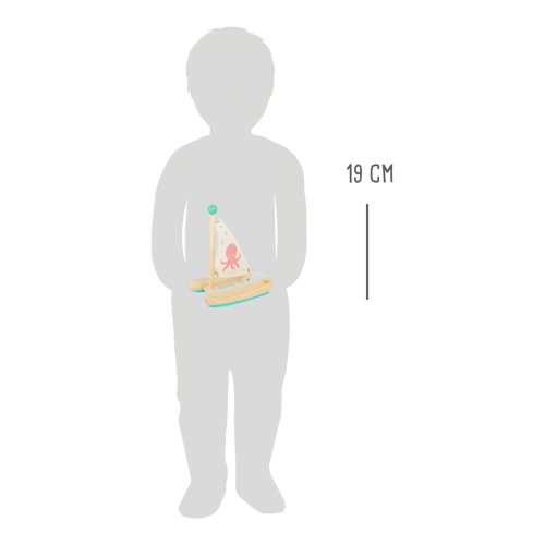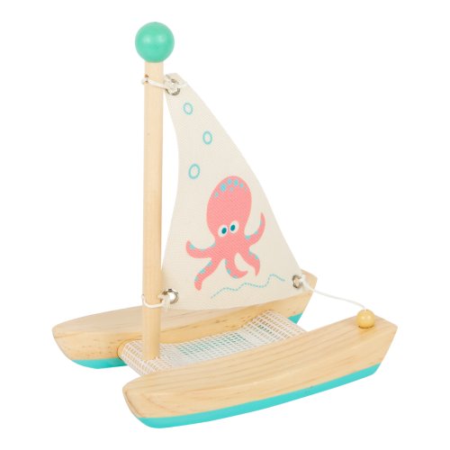 Drevená loďka pre všetkých malých námorníkov. Hračka je vyrobená z kvalitného dreva a farbená v pastelových tónoch. Na plachte má loď vyobrazenú chobotnicu. Rozmery katamaránu sú cca 16 x 12 x 19 cm. Vhodné pre deti od 2 rokov.
