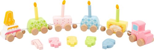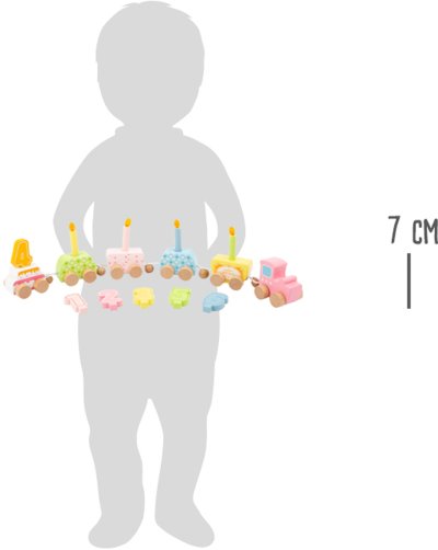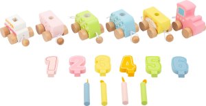 Ďalšia zastávka - oslava narodenín! Krásny drevený vláčik v pastelových farbách je to pravé pre každého oslávenca. Vláčik obsahuje: lokomotívu, 5 vagónikov, číslice 1-6 a drevené sviečky Vhodné pre deti od 12 mesiacov.