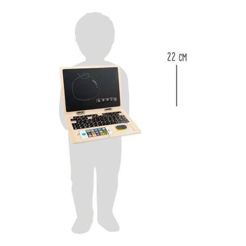Píšte na klávesnici rovnako ako dospelí! S týmto dreveným notebookom môžu mladí počítačoví nadšenci získať prvé skúsenosti s IT. Dieliky s písmenkami, číslami a znakmi môžu deti jednoducho presúvať a vytvárať tak slová alebo riešiť matematické problémy a to na magnetickej doštičke – displeji notebooku. Kriedou potom deti môžu kresliť obrázky alebo písať slová, ktoré jednoducho zmyjú hubkou. V balení je aj drevený smartfón. Notebook je možné jednoducho premiestňovať a prepravovať vďaka jeho kompaktnej veľkosti. Balenie obsahuje 83 dielov. Hlavné vlastnosti: kompakt veľkosť magnetickej kresliacej tabule v dizajne notebookuobahuje 78 magnetov, 1 špongiu, 1 mobilný telefón, 2 kriedy, 1 drevený notebook
