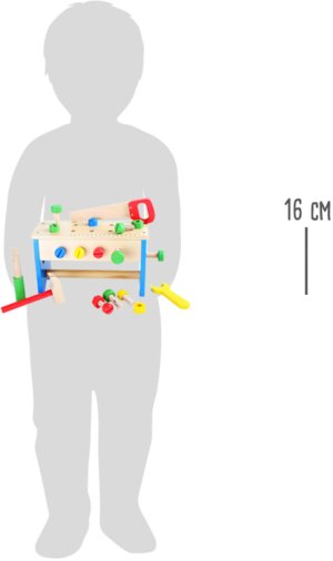 Môžete tu rezať, zatĺkať a skrutkovať. Tento farebný pracovný stôl sa v okamihu premení na box na náradie, a tak môžete všetko náradie zo svetlého dreva rýchlo uložiť. Skrutkovač, kľúč, kladivo, pílu, skrutky a matky je možné do boxu uložiť a vďaka praktickému madlu ich vziať všade so sebou. Čo postavíme nabudúce a kam to so sebou vezmeme? Hlavné vlastnosti: balenie obsahuje 30 ks 2v1 - pracovný stôl a boxtrénuje jemnú motoriku