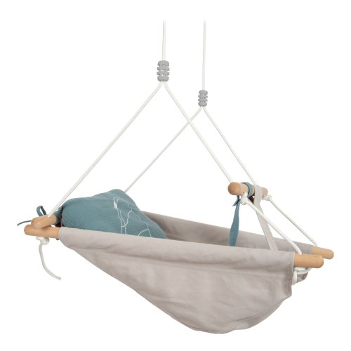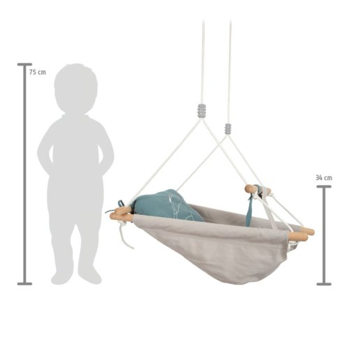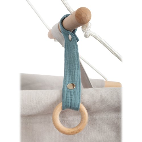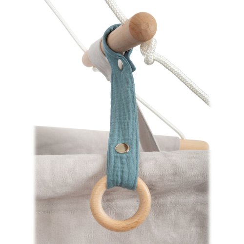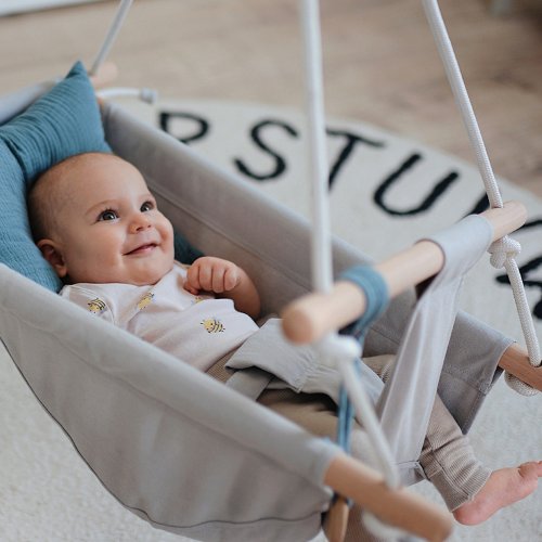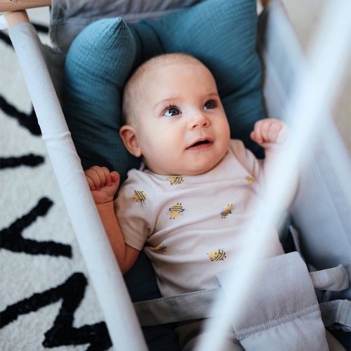 Textilné prevedenie hojdačky ponúka mimoriadny komfort vďaka premyslenému designu, mäkkému, odnímateľnému vankúšu a 3bodovému pásu. Vankúš je pripevnený k hojdačke pomocou pútok. Ľahko udržiavateľná textília plochy na ležanie sa optimálne prispôsobí tvaru tela dieťaťa. V dymovo modrej farbe, hravo doplní interiér alebo osvieži letnú záhradku. Pevná konštrukcia zo starostlivo opracovaného masívneho dreva, bezpečnostné popruhy a pás s rukoväťami pomáhajú zaistiť vysokú bezpečnosť pri hojdaní najmenších. Vysoký podiel masívneho dreva, prírodné materiály a trendy farba robia z tejto detskej hojdačky absolútny pútač. To pravé pre spokojné bábätká. Hlavné vlastnosti: pohodlná detská hojdačkatkanina sa prispôsobí telu dieťaťakvalitné, hladké drevomäkký oddeliteľný vankúš je možné zaistiť pútkyv balení 3bodový pás, oddeliteľný senzorický krúžokviditeľné drevo a ďalšie prírodné materiályje možné pripevniť aj ďalšie doplnky, napr cumlíknosnosť 30 kg