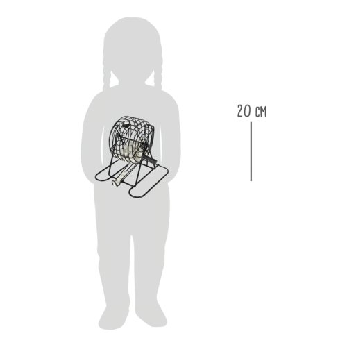 Klasická súťažná hra "Bingo" s farebnými žetónmi, bielymi guličkami, plastovým zásobníkom a žrebovacím kovovým bubnom. Každý hráč si môže vybrať svoju vlastnú farbu žetónov. Kľučka otáča bubnom a akonáhle sa zmení smer, prvá očíslovaná gulička spadne do priehradky. Komu sa podarí umiestniť správnu kombináciu ako prvú? Svoje šťastie si môžu skúsiť ako malí, tak veľkí hráči . Hlavné vlastnosti: obsahuje: farebné žetóny, biele guličky, plastový zásobníklosovací bubon je kovový deti sa učia spoznávať čísla