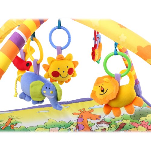 Kto by nechcel vyvádzať obklopený tými najroztomilejšími zvieratkami! Príjemne mäkká pestrofarebná podložka zdobená zvieracími motívmi umožňuje najmenším pohodlne ležať a hrať sa s plyšovými hračkami pod klenbou z mäkkých a pružných podpier. Pútavé hračky rôzne hrkajú, alebo pískajú, prispievajú tak k vývoju detských zmyslov a motoriky, motivujú a postupne učia deti sedieť. Sú zavesené na otvárateľných krúžkoch umožňujúcich ich odopnutie, deti tak môžu mať svojich obľúbencov vždy pri sebe. Podložka je skladná a ľahko rozložiteľná, balená a dodávaná v praktickej, ľahko presnosnej plastovej taške . Hlavné vlastnosti: príjemne mäkké, bezpečné a pohodlné prevedenie5 odnímateľných plyšových hračiekzvukové efekty hrkálenia a pískaniapraktické balenie