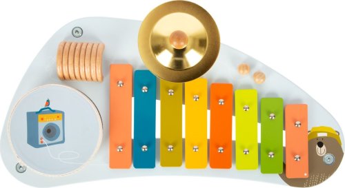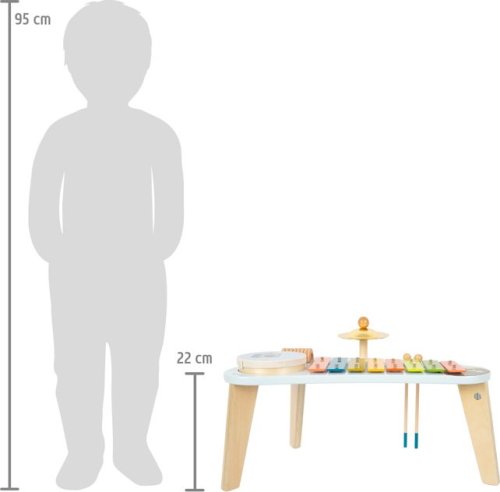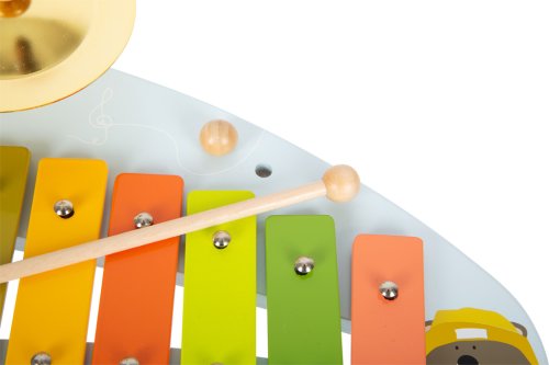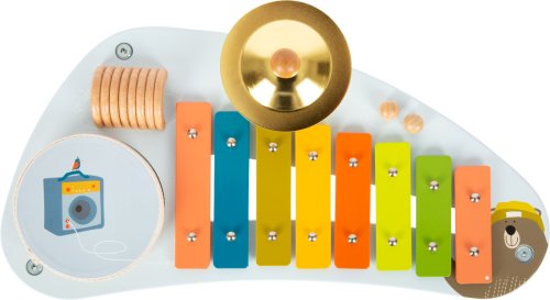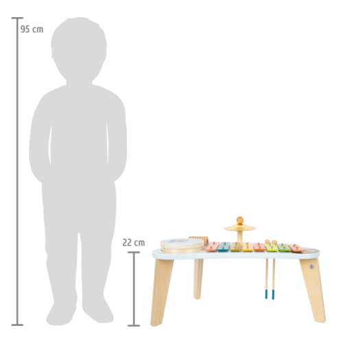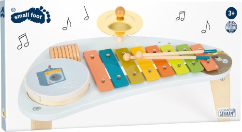 robustne skonštruovaný hudobný stolček stojí na troch nohách a povzbudzuje deti, aby hrali na rôzne nástroje a objavovali nové zvuky s činelmi, xylofónom, hrkálkou a odnímateľným bubnom klapky xylofónu sú farebne odlíšené, takže prvé pesničky sú pre deti ľahké a dodáva sa s robustnými paličkami z mäsa vyniká svojim veselým dizajnom a harmonickou kombináciou prírodného dreva a moderných farieb okrem nácviku akustického vnímania tento nástroj hravo trénuje aj zmysel pre rytmus, rytmiku a prvé porozumenie hudobným tónom rozvíja jemnú motoriku a kreativitu rozmery hracej plochy: cca 42 x 21 cm paličky: 1,5 cm