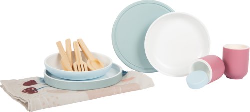 Moderná sada riadu vrátane tanierov, šálok, príborov a prestierania pre dve osoby. Vysoko kvalitné spracovanie z robustného a odolného dreva, ktoré je vyrobené tak, aby vám vydržalo. Ponúka ďalšie učebné efekty s tlačeným prestieraním, ktoré ukazujú, ako správne prestrieť stôl. Moderný vzhľad s lineárnymi tvarmi a kombináciou prírodného dreva s trendy farbami dymovo modrej a bobuľovo červenej. Dokonalá harmónia farby a designu s kolekciou Tasty kde nájdete detskú kuchynku a ďalšie kuchynské produkty. Pre obzvlášť realistickú zábavu pri hraní na role v detskej kuchynke. Podporuje rozvoj jemnej motoriky, sociálnych zručností a ďalších každodenných zručností. Vďaka vyváženému dizajnu a modernej farebnej schéme sa obzvlášť dobre hodí do moderného prostredia detskej i obývacej izby. Hlavné vlastnosti: Podporuje rozvoj jemnej motoriky a sociálnych zručností Obsahuje 12 dielov