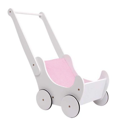 Kto chce ísť na prechádzku s kočíkom pre bábiky? Klasická farebná kombinácia v bielej a ružovej poteší srdce mamičiek i bábik. Každá bábika sa tu bude cítiť pohodlne. Tento kočík je vyrobený zo stabilného, bielo lakovaného dreva v zaoblenom dizajne. Kolesá na kovových osiach potiahnuté gumou zaručujú tichú jazdu. Výška rukoväte je 52 cm. Hlavné vlastnosti: pogumované kolieska pre tichú a bezpečnú jazdurozvíja kreativitu a sociálne zručnostiperfektné na dlhé prechádzky