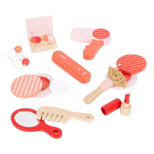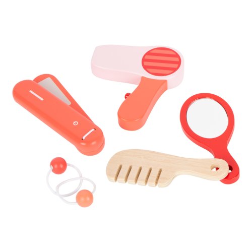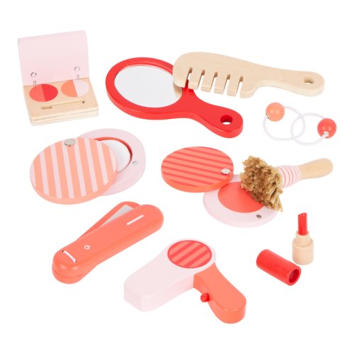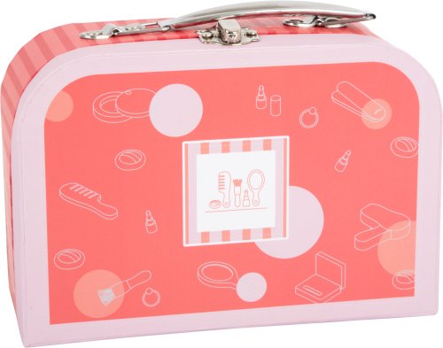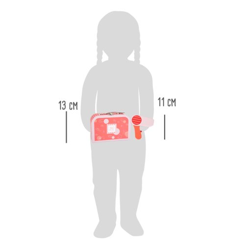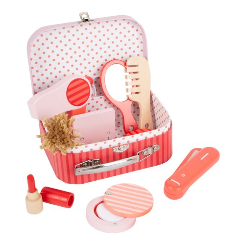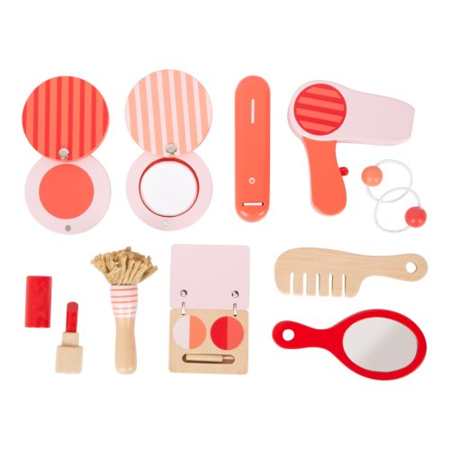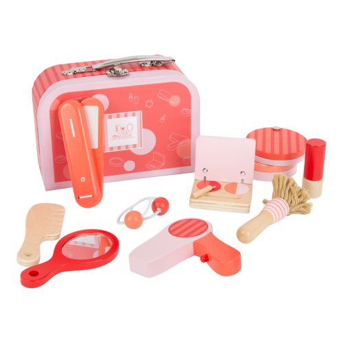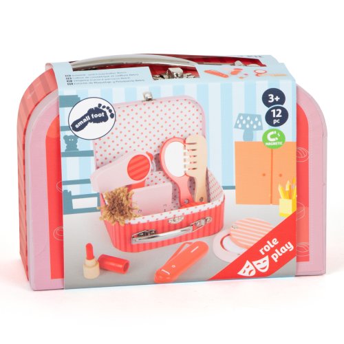 Make-up umelci a umelkyne, toto je pre vás! Kozmetický kufrík vyrobený z dreva je perfektný na hranie na rolky. Obsiahly set sa skladá z hrebeňa, zrkadla, fénu, rúžu, púdru, očných tieňov, žehličky na vlasy a tiež gumičiek. Napokon sa môžete namaľovať ako mamička! Kufrík má zámok, všetky doplnky sa doňho zmestia pohodlne. Kto si nechá upraviť vlasy ako prvý? Hlavné vlastnosti: 10 rôznych kozmetických pomôcokpraktické balenie