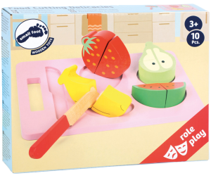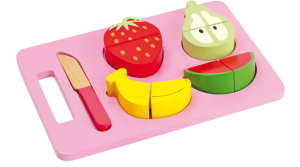 Máš v kuchyni všetko pripravené na podávanie zdravej desiaty? Ovocie je umyté? Zostáva ich už len nakrájať. Prichystaj si doštičku a nôž a môžeš začať - banán, jahoda, hruška a melón. Súčasťou balenia je doštička, drevený nôž a 4 druhy ovocia, ktoré deti môžu krájať na polovicu. Ovocie držia v celku pomocou suchého zipsu. Vhodné pre deti od 3 rokov.