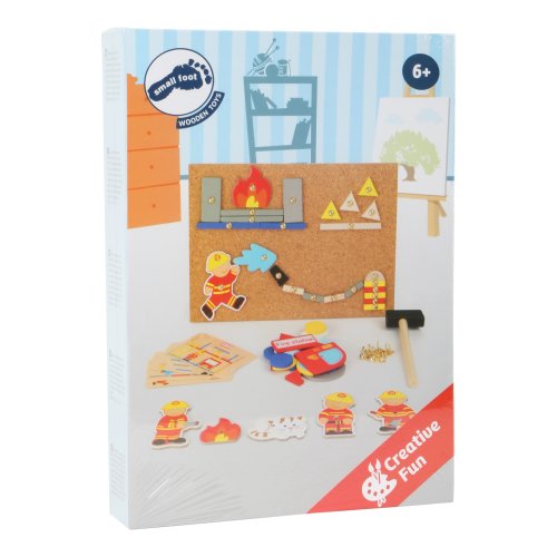 S touto hrou si môže každé dieťa vyrobiť svoju vlastnú hasičskú stanicu na nástennej doske. Drevené a kartónové dieliky skladačky majú predvŕtané otvory, malé klinčeky možno ľahko zatĺcť do korkovej dosky dreveným kladivkom. Balenie obsahuje aj štyri obojstranne potlačené karty s návrhmi motívov. Hlavné vlastnosti: podporuje kreativitu a koncentráciu podporuje jemnú motoriku praktický úložný box