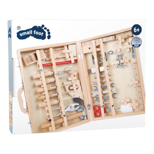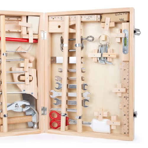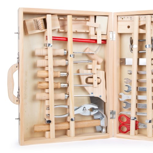 Kufrík Deluxe je komplexná sada náradia: Závesná drevená krabica so 48 dielmi pre malých domácich majstrov! V kufríku Deluxe nájdete všetko potrebné drevené aj kovové náradie pre všetky druhy prác a opráv. Nájdete v ňom kľúče, skrutkovače, pílu, nožnice, dláto, tesársku ceruzku, šesťhranný kľúč, kladivo a ďalšie! Každá položka má svoje miesto v kufri, všetky diely sú vybavené poistkami, ktoré ich na svojom mieste držia. Hlavné vlastnosti: komplexná sada obsahuje 48 dielov praktický drevený kufor na uloženie