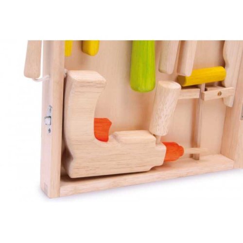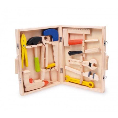 Pozor všetci malí remeselníci! V tomto vysoko kvalitnom drevenom kufríku nájdete 12 drevených nástrojov. Nástroje sú na svojom mieste zaistené otočnými poistkami, vŕtačka suchým zipsom. Držadlá kufríka sú vyrobené z textilnej šnúry a dreva pre pohodlné uchopenie. S týmto kufríkom na náradí môžu deti asistovať dospelým pri ich práci a súčasne sa učiť ovládať rôzne ručné nástroje. Kufrík je skvelou pracovnou hračkou pre malé remeselné ky. Hlavné vlastnosti: zaistenie náradia proti pohybu poistkami a suchým zipsom obsahuje 12 drevených nástrojov vhodný do každej detskej dielne