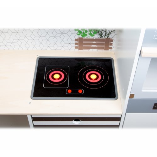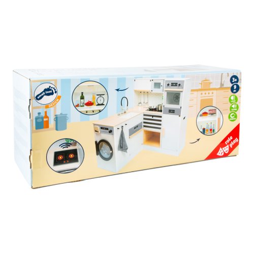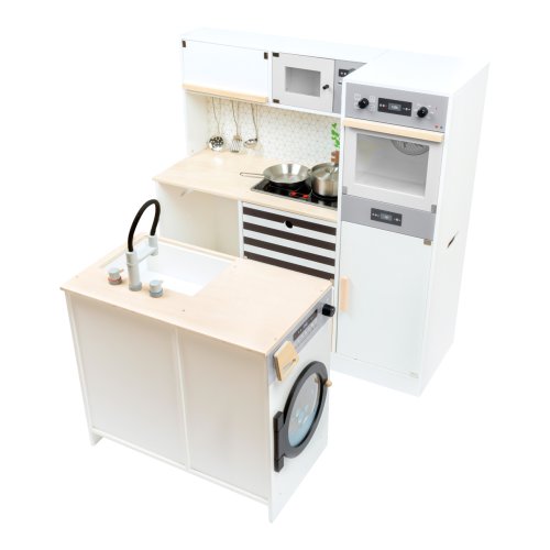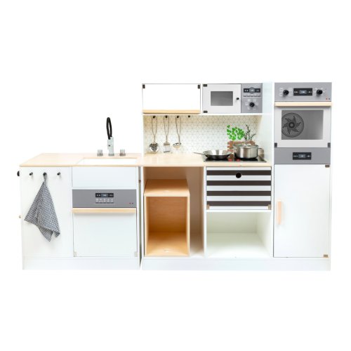 Pre všetkých kuchárov a gazdinky! Táto veľká, plne vybavená detská kuchynka ponúka všetky spotrebiče modernej domácnosti. Vďaka svojmu stavebnicovému systému je možné zostaviť ako rohovú kuchyňu, alebo kuchynskú linku s fungujúcim ostrovčekom, ponúka tak veľa priestoru a možností aj pre hru viacerých detí naraz. Otočné gombíky cvakajú a varná doska s batériovo napájaným (batérie nie sú súčasťou balenia) svetlom a zvukom zaručujú realistické potešenie z hry. Skrinky zaisťujú dostatok úložného priestoru a sú vybavené dvierkami. Súčasťou je vysoko kvalitný riad vyrobený z kovu. Pre kuchynku sa ponúka aj veľké množstvo doplnkového príslušenstva. Výrobok vyžaduje montáž, dodávané s obrázkovým návodom na zostavenie. Hlavné vlastnosti: detská kuchynka: sporák, rúra, mikrovlnná rúra, chladnička, úložné priestory kuchynský ostrovček: drez, práčka, umývačka riadu príslušenstvo: hrniec, panvica, otočný tanier, lyžica, naberačka, utierka svetelné a zvukové efekty (batérie využitierobustné a odolné prevedenie