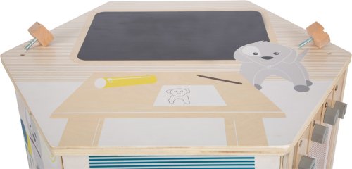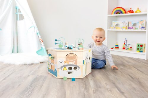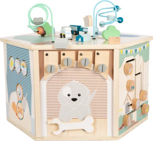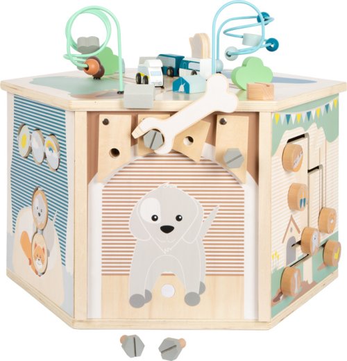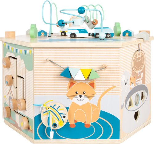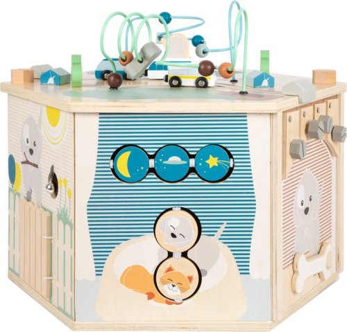 XXL motorická interaktívna kocka v tvare hexagónu je vyrobená z pevného dreva a má rôzne aktivity na 8 stranách. Nájdete tu napríklad korálkový labyrint, vkladačku, otočné doštičky, prevliekačku/triedenie farieb a skladačku. Rolnička stimuluje sluch a trénuje sluchové vnímanie. Detailné ilustrácie deťom odhalia každodenný život zvierat. Oddeliteľné a obojstranné veko môžete pripevniť bez pomocou náradia, na jednej strane korálkový labyrint a vláčikodráha, na druhej strane kriedová tabuľa a ilustrácie kempovania. Veko tiež môžete použiť ako podložku na kreslenie alebo pri hre na zemi. Motorická kocka ponúka mnoho úložného priestoru pre vlastné doplnky - navliekacie prvky, kosti pre psov, ktoré slúžia ako náradie; veľké drevené skrutky, vkladacie prvky, drevené stavebné kocky a figúrky (krovie, psy, mačky, cestné zátarasy, rampy). V balení 3 vozidlá: minibus, karavan a príves. Kocka má pogumované nohy, chráni tak podlahy. Jemné farby, jasne viditeľné drevo, bude sa hodiť do každého interiéru. Hlavné vlastnosti: Osem strán plných aktivítTrénuje jemnú motoriku, sluch, hmatV balení 3 autíčka