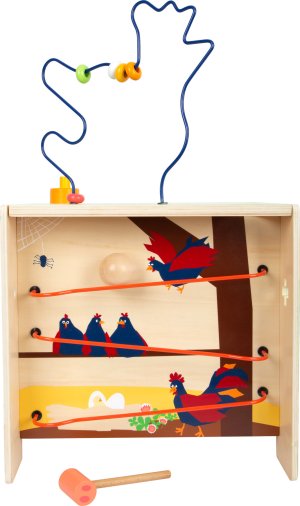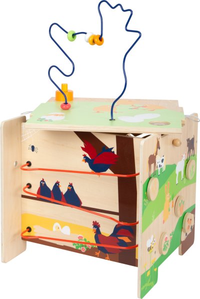 Na dedine sa toho deje skutočne veľa. Korálkový labyrint v tvare sliepočky, vkladačka, posuvné dieliky, hra zoradenia farieb, zatĺkanie kladivkom, deti sa môžu hrať na všetkých piatich stranách kocky. Motorická kocka má peknú ilustráciu zvieratiek z farmy. Vrchnú stranu s labyrintom môžete odviazať a otočiť, aby ste mohli kocku skladovať bezpečne alebo z nej vytvorili stoličku pre deti. Kto čo je? Vo vkladačke musia deti nakŕmiť zvieratká správnou potravou. Motorická kocka trénuje poznávanie farieb a tvarov, aj deťom dodá základné informácie o zvieratách farmy. Unikátna motorická kocka vyrobená z dreva s kovovými prvkami. Hlavn é vlastnosti motorickej aktivity na piatich stranáchvkladačkazatĺkačkakorálkový labyrintlze pretransformovať na stoličku