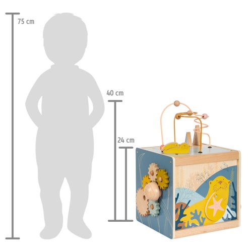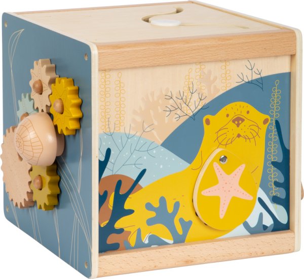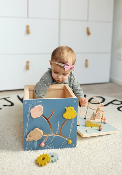 Všestranná drevená kocka pre motorické aktivity s dvoma korálkovými bludiskami, gumovými stromami, za ktoré sa dá chytiť, a tiež posuvným bludiskom na veku. Hru na ozubené kolieska so štyrmi odnímateľnými hviezdicami a na dotyk mäkkou medúzou je možné použiť na priraďovanie tvarov. Druhé posuvné bludisko aj niekoľko zrkadiel a malých klapiek nabáda deti k tomu, aby si veci skúšali, objavovali a udivene pozorovali. Odnímateľné veko je možné uložiť dovnútra kocky, aby sa pri skladovaní ušetrilo miesto. Motorická kocka pôsobí skvelým dojmom vďaka kombinácii veľkého množstva prírodného dreva a jemných, módnych farieb a ponúka príjemný haptický dojem vďaka zaobleným hranám. Hlavné vlastnosti: 5 hracích plôchvnútro kocky ponúka ďalší úložný priestorkvalitné ilustrácie v módnych farbáchtrénuje vnímanie, zručnosť a jemnú motoriku počas hry, učenie a objavovanie