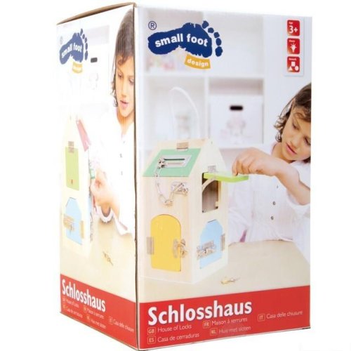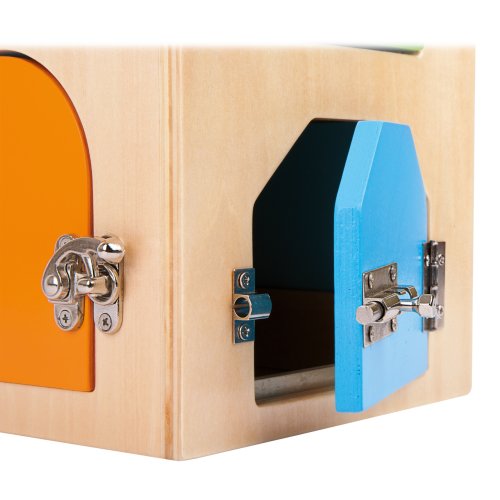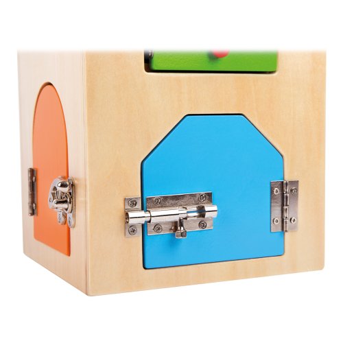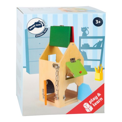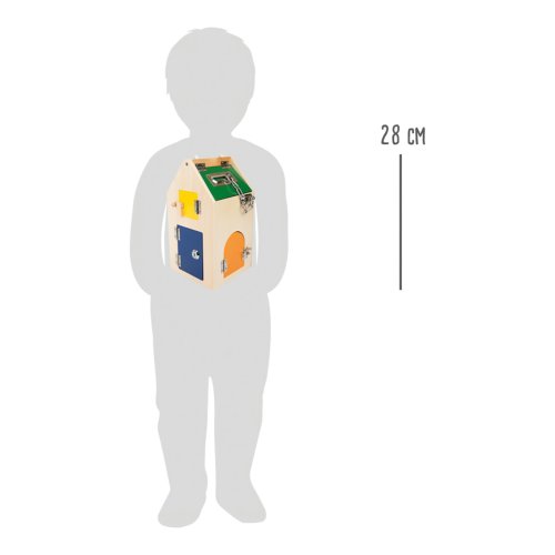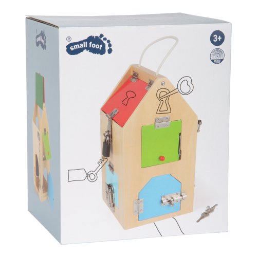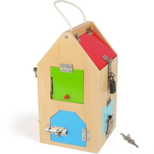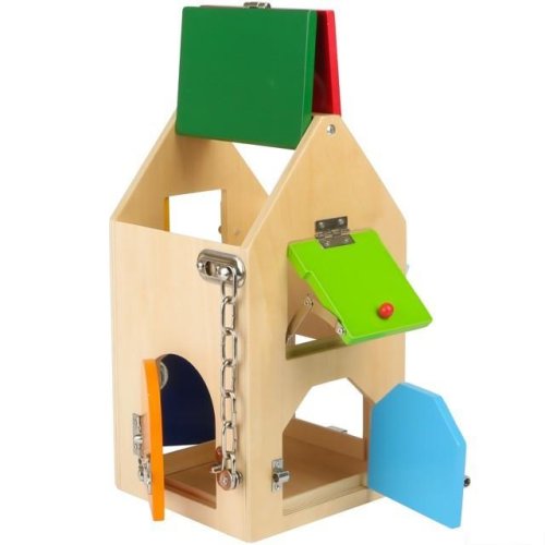 Drevený domček s rôznymi zámkami a zápätkami, dvere na reťaz, D-zámky a cylindrické vložky. Tento dom bude mať rád každý správny chlapec na skrývanie svojich pokladov. Motorická hračka rozvíja zručnosti detí!