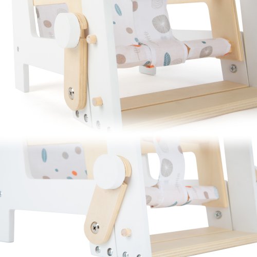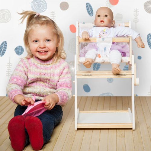 Multifunkčná vysoká stolička pre bábiky, ktorá určite nadchne mladších aj starších „rodičov“ bábik. Má jednoduchý škandinávsky dizajn, je vyrobená z kvalitných materiálov. Len pár pohybov rúk a vysoká stolička môže byť premenená na stoličku so stolom. Je vhodná pre bábiky a plyšové hračky do ~46 cm. Vďaka jednoduchému dizajnu sa hodí do každého interiéru. Je viditeľne drevená a má zaoblené hrany. Hlavné vlastnosti Škandinávsky designPre bábiky a plyšové hračky do 46 cmZaoblené hrany Little Button Rad atraktívneho príslušenstva pre bábiky Little Button ponúka pestrú paletu výrobkov, od kočíka cez jedálenskú stoličku až po skriňu. Zákazníkov ľahko zaujmú jednotným funkčným a decentným dizajnom využívajúcim priame línie a striedme neutrálne farby. Vďaka tomu spolu môžu vytvoriť ucelené harmonické súpravy, ktoré vkusne doplnia moderný interiér. Dômyselná konštrukcia a kvalitné spracovanie pomáhajú zaistiť vysokú stabilitu, bezpečnosť a dlhú životnosť. Založte s ich pomocou štýlový kútik pre bábiky, kde môžu Vaše deti rozvíjať svoju fantáziu a opatrovateľské schopnosti.