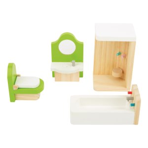 Táto 4 dielna sada vybavenia do kúpeľne má veľkosť pre ohýbacie bábiky do 12 cm. Je vyrobená z masívneho dreva pre dlhú životnosť. Hlavné vlastnosti: pri hre táto sada prebúdza fantáziu a precvičuje jemnú motoriku