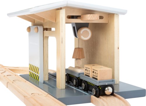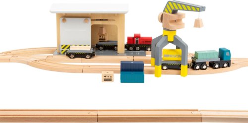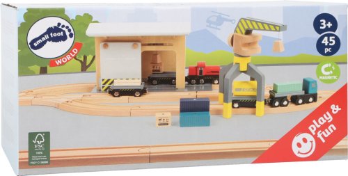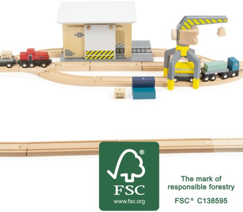 Toto nákladné depo vyrobené zo 100% certifikovaného dreva FSC® drží krok s mnohými vláčikodráhami. Deti môžu nakladať a vykladať kontajnery pomocou žeriava a prevážať ich po koľajniciach do depa. Obsahuje 25 koľají. Zostavu dopĺňajú magnetické drevené bloky v dizajne nákladu a kontajnerov, žeriav otočný o 360 ° a vozidlá s magnetickými prívesmi. Posuvná stena v budove stanice s integrovanou kladkou ponúka flexibilitu pre celý rad zaťažení. Aký tovar je v ďalšej dodávke? Hlavné vlastnosti: sada je kompatibilná so všetkými bežnými vláčikodráhami obsahuje 25 koľají vyrobených zo 100% certifikovaného dreva FSC® Značka a certifikát FSC® (Forest Stewardship Council) zaručuje, že drevo, z ktorého bol produkt vyrobený, nebolo vyťažené nelegálne a pochádza z lesov obhospodarovaných šetrným prírode blízkym spôsobom, v ktorom sú dodržiavané prísne environmentálne a sociálne požiadavky. Značka FSC® na výrobku znamená, že svojim nákupom pomáhate chrániť lesy a podporujete šetrné, zodpovedné či prírode blízke hospodárenie, vďaka ktorému sú naše lesy stabilnejšie, zdravšie, majú prirodzenú druhovú skladbu a lepšie odolávajú negatívnym následkom klimatických zmien.