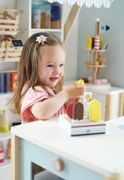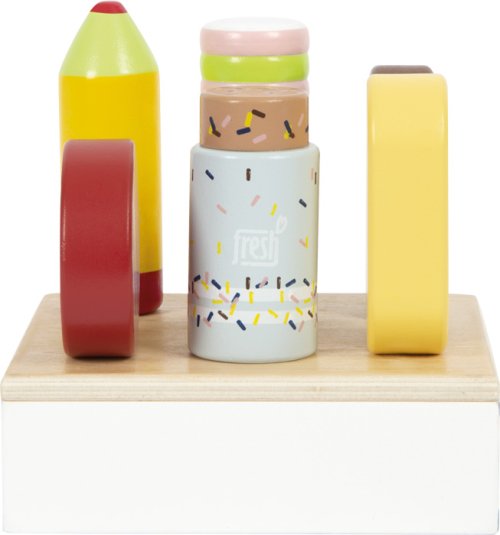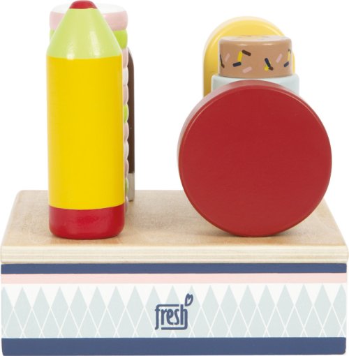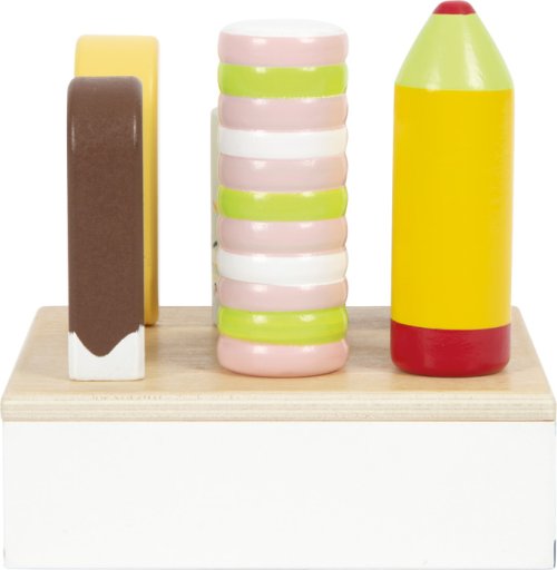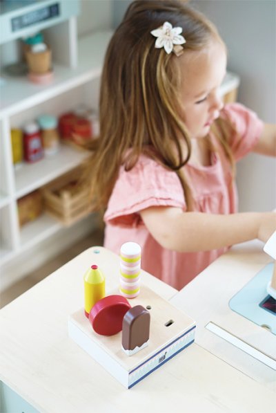 Súprava nanukov pre malých predavačov zmrzliny. Tento praktický stojan na zmrzlinu s otvormi pre 6 rôznych príchutí prináša osviežujúci pocit zo zmrzlinárne do obchodu s potravinami alebo do detskej kuchynky. Zaisťuje tiež, aby boli studené pochúťky podávané v správnom štýle. Každá jednotlivá zmrzlina je vyrobená z certifikovaného dreva FSC® a vyzerá veľmi podobne ako jej skutočné náprotivky. Jemné sfarbenie a vysoký podiel viditeľného dreva robia z tohto herného setu skutočný pútač v detskej izbe. Každé dieťa miluje nanuky! Najobľúbenejší variant zmrzliny na cesty by nemal chýbať v žiadnej detskej izbičke. Dizajn a veľkosť zmrzlinového stánku sú zladené s kompaktným pultom „čerstvej“ zmrzliny (12416), takže sa oba ideálne dopĺňajú. Hlavné vlastnosti: 6 rôznych druhov zmrzlínvyrobených z odolného FSC® ideálny pre kompaktný „čerstvý“ zmrzlinový pult (12416)obľúbený doplnok do detských kuchýň a obchodov s potravinami Značka a certifikát FSC® (Forest Stewardship Council) zaručuje, že drevo, z ktorého bol produkt vyrobený, nebolo vyťažené nelegálne a pochádza z lesov obhospodarovaných šetrným či prírode blízkym spôsobom, v ktorom sú dodržiavané prísne environmentálne a sociálne požiadavky. Značka FSC® na výrobku znamená, že svojim nákupom pomáhate chrániť lesy a podporujete šetrné, zodpovedné či prírode blízke hospodárenie, vďaka ktorému sú naše lesy stabilnejšie, zdravšie, majú prirodzenú druhovú skladbu a lepšie odolávajú negatívnym následkom klimatických zmien.