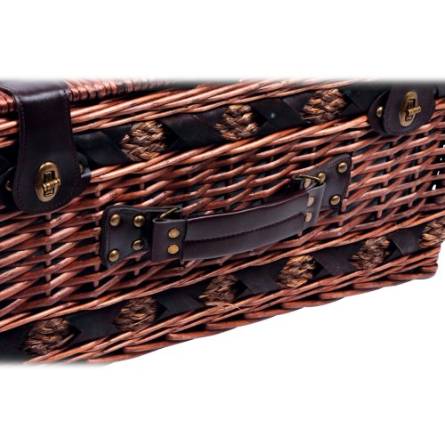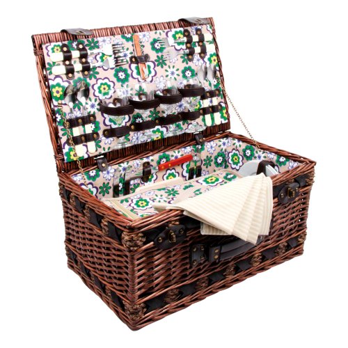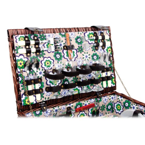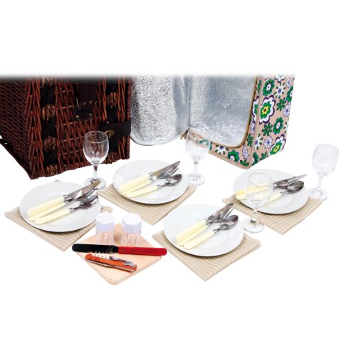 Perfektne vybavený prútený piknikový kôš so silnými prútenými úchytmi a bezpečnými koženými pútkami. Kôš je kompletne vybavený pre 4 osoby vrátane tanierov, príborov, pohárov na víno, nožom, koreničkou, soľničkou a obrúsky. Kôš je tiež vybavený vyberateľným chladiacim vreckom, ktoré udržuje jedlo a pitie v chlade! Hlavné vlastnosti: kôš je kompletne vybavený, vyrobený z prírodného prútívyjímateľný chladiaci box