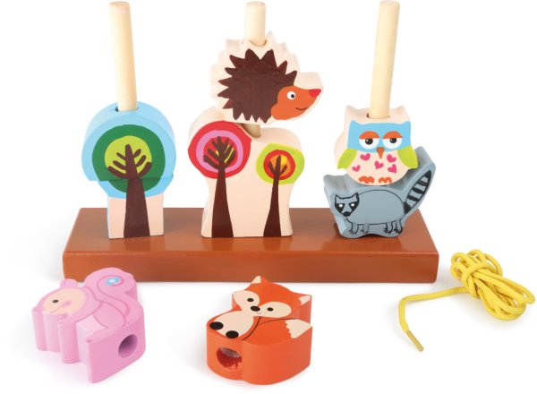 Táto sada umožňuje dieliky navliecť na šnúrku alebo na drevené kolíky. Ježko, líška, veverička, mýval a sova sú hlavnými hrdinami tejto hry. 3 stromy dotvára lesnú atmosféru. Tréning môže začať! Hlavné vlastnosti: 8 navliekacích dielov, stojan a šnúrka kompaktná veľkosť cvičí jemnú motoriku