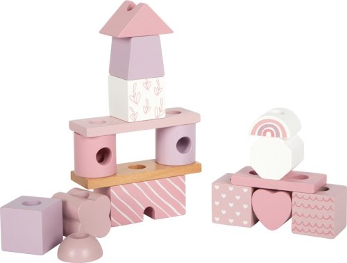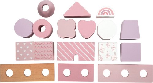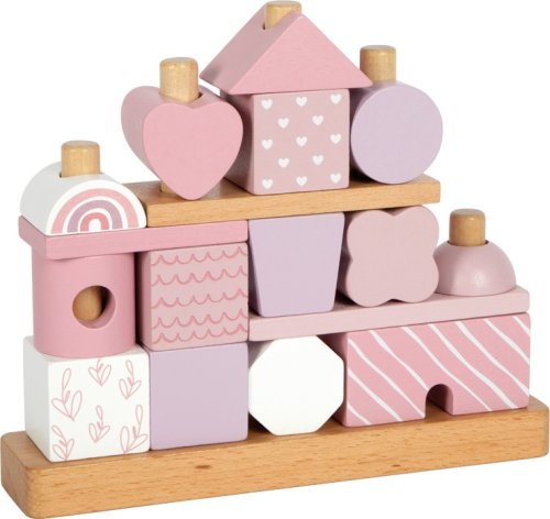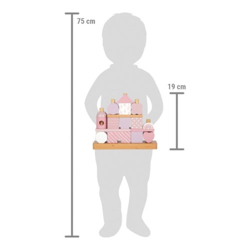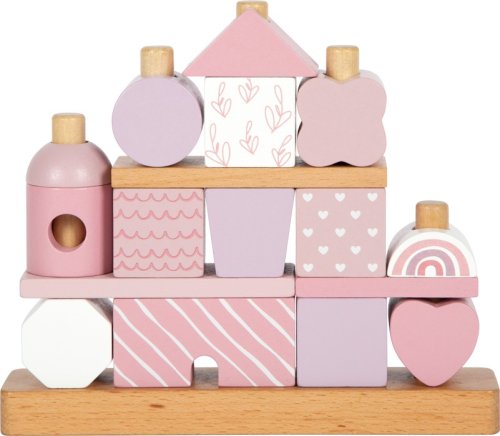Tento drevený stohovací domček v jemných pastelových odtieňoch ružovej s prírodnými prvkami očarí nielen svojim dizajnom, ale aj variabilitou. Obsahuje 18 rôzne tvarovaných a zdobených dielikov, ktoré deti inšpirujú k nasadzovaniu na drevené tyče a vytváraniu stále nových variantov domčeka. Pri hraní si tak rozvíjajú jemnú motoriku, koordináciu a kreativitu. Jednotlivé kocky sú starostlivo vyrobené z kvalitného dreva s bezpečne zaoblenými hranami, a preto sú ideálne aj pre malé detské ručičky. Ideálna ako dekorácia do detskej izby a poteší aj ako dá rek. Hlavné vlastnosti: 18 drevených dielikov v rôznych tvaroch a vzoroch jemnej pastelovej farby v kombinácii s prírodným drevom rozvíja jemnú motoriku, koordináciu a kreativitu kvalitné a bezpečné spracovanie so zaoblenými hranami vhodný ako hračka aj ako dekorácia do izby ideálny darček pre najmenšie deti