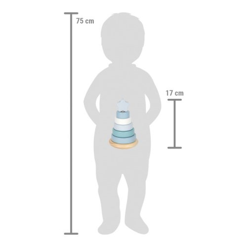 Táto drevená stohovacia veža v jemných pastelových odtieňoch modrej s prírodnými prvkami je zakončená hviezdou, ktorej hračke dodáva osobité kúzlo. Rôzne farebné a veľkostne odstupňované krúžky pomáhajú deťom precvičovať jemnú motoriku, sústredenie aj vnímanie veľkostí. Veža má zaoblenú základňu, vďaka ktorej sa môže ľahko pohupuje – to z nej robí nielen edukatívnu, ale aj zábavnú hračku. Bezpečná, pohyblivá centrálna tyč sa pri zatlačení ohýba, čo zaisťuje väčšiu bezpečnosť pri hre aj ľahšie navliekanie krúžkov. Hlavné vlastnosti: 7dielna nasadzovacia veža s hviezdoujemné pastelové odtiene v kombinácii s prírodným drevompohyblivá centrálna tyčrozvíja motoriku, koncentráciu a vnímanie veľkostíbezpečnej zaoblenej hrany a odolný materiálvhodná ako hračka aj ako dekorácia