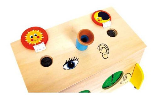 Trénujte všetky svoje zmysly! Tento krásny box je vyrobený z prírodného a farebného lakovaného dreva, nájdete v ňom dva otvory na ruky, ktoré sú prekryté textilom, vďaka ktorým budú deti trénovať hmat. Ďalej jeden otvor s kaleidoskopickým sklíčkom, ktorý potrénuje zrak, a tiež lievik na počúvanie. Čo by mohlo byť vo vnútri? Odklopné viečka vrchných otvorov majú pekný maľovaný motív slnka a mesiaca. Deti sa naučia poznávať rôzne tvary, hmotnosti, materiá ... Hlavné vlastnosti: multifunkčné, trénuje všetky zmyslylakované drevo a textilodklopné viečka s motívom slnka a mesiaca