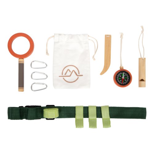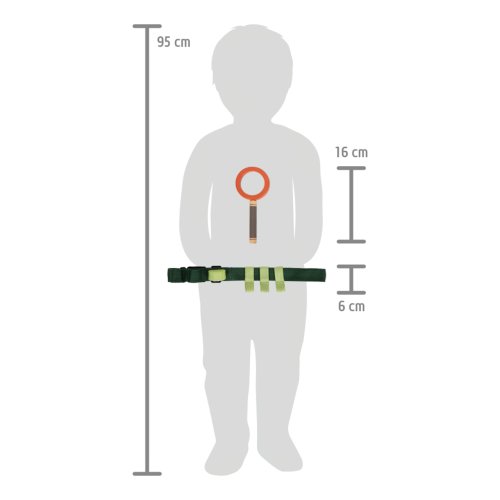 Pre milovníkov dobrodružstva! Tento opasok s vybavením ponechá detské ruky voľné pri každom dobrodružstve. Zmestí sa do neho pohodlne všetko vybavenie: píšťalka z pevného dreva, lupa, pinzeta, kompas, lano a nylonový vrecúško, ktoré možno pripevniť na pútko alebo karabínu opasku. Opasok je možné ľahko zapnúť na pracku a má tiež nastaviteľnú veľkosť . Je ideálny na výlety, výstupy, expedície, za pomoci vybavenia môžu bádať a objavovať nové veci na záhrade, v lese alebo na lúke. Viditeľné drevo, zaoblené hrany a farby prírody, to sú hračky z radu „Discover“. Hlavné vlastnosti: odolný opasok pre mladých prieskumníkov s pútkami, karabinamina staviteľná veľkosť v balení drevená píšťalka, lupa, pinzeta, kompas, lano a textilné vrecko pekný dizajn s viditeľným drevom a zaoblenými hranami hodí sa k ostatným produktom z radu „Discover“