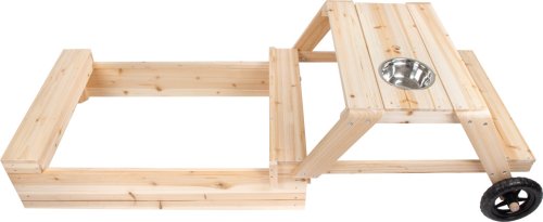 Multifunkčné pieskovisko 3v1 zaistí deťom veľa zábavy, ale aj miesto na odpočinok. Kompaktné pieskovisko z robustného neošetreného masívneho dreva je vďaka svojej unikátnej konštrukcii pieskoviskom, stolom na tvorenie a posedením v jednom. Ponúka tak extra porciu hernej hodnoty na malom priestore. V prípade posunutia hornej časti pieskoviska je možné súčasne využívať pieskovisko a sedenie so stolom. Vďaka odnímateľnej kovovej miske sa z povrchu stola rýchlo stane stôl na tvorenie napr. bahna. Otvor v ploche stola ponúka priestor pre malý slnečník. Keď sa pieskovisko nepoužíva, kvalitný textilný poťah Oxford zaistí, že pieskovisko zostane čisté a chránené pred znečistením . Ideálne pre terasy, balkóny alebo malé záhrady. Vďaka rôznym miestam na sedenie ponúka pieskovisko nespočetné množstvo príležitostí k spoločnej hre a kreatívnym činnostiam s pieskom a bahnom. Vďaka priestorovo úspornému dizajnu a robustným kolieskam je možné pieskovisko 3 v 1 rýchlo zložiť a bez námahy presunúť. Keď sa pieskovisko nepoužíva, je možné ho zakryť kvalitnou plachtou. Štyri elastické pásky a upevňovacie body udržujú plachtu bezpečne na mieste. Na dlhodobé použitie sa odporúča ochranná lazúra na drevo . Hlavné vlastnosti: multifunkčné pieskovisko 3v1 vyrobené z masívneho drevakompaktné pieskovisko na terasy, balkóny a záhradysúčasťou kvalitná plachta proti znečisteniu pieskoviska vďaka kolieskam je možné pieskovisko bez námahy presunúť