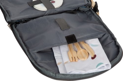 Premeňte každý piknik na nezabudnuteľný zážitok s piknikovým batohom! Tento praktický batoh obsahuje všetko, čo potrebujete pre pohodlné stolovanie vonku: drevený tanier, hrnček a jedálenské náčinie pre dve osoby. Ďalej v ňom nájdete termosku, skladací nôž a piknikovú deku. Priestranné vnútorné vrecko na zips umožňuje bezpečné uloženie všetkého príslušenstva vďaka pružným pásikom a suchému zipsu. Nastaviteľné ramenné popruhy poskytujú optimálne pohodlie pri nosení a umožňujú správne prispôsobenie batohu dieťaťu. Moderný vzhľad, kombinujúci neutrálnu bielu farbu, prírodné drevo a populárne trendy farby, harmonicky zapadá do každej detskej izby a skvele sa hodí k ďalším produktom z radu „Tasty“. Tento batoh je ideálnym spoločníkom pre nezabudnuteľné piknikové chvíle, kreatívne hranie a výlety do prírody! Balenie obsahuje: 1 batoh, 1 termoska, 1 pikniková deka, 2 lyžice, 2 nože, 2 vidličky, 2 hrnčeky, 2 taniere, 1 vreckový nôž. Hlavné vlastnosti: moderný piknikový batoh s množstvom príslušenstva pre dve osoby podporuje rozvoj jemnej motoriky, sociálnych zručností a každodenných zručností zavinovací zips a oddelené vnútorné vrecko pre ľahké skladovanie pružné elastické pásky bezpečne držia príslušenstvo nastaviteľné ramenné popruhy pre vysoký komfort nosenia moderný dizajn v kombinácii s bielou, prírodným drevom asty“