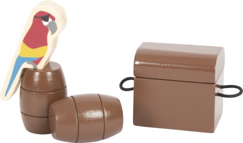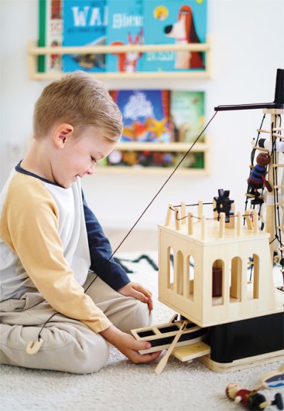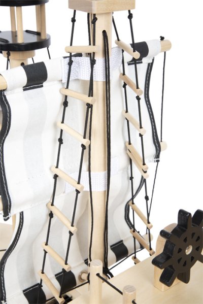 Ahoj piráti! Táto prepracovaná pirátska loď vyrobená z robustného dreva splní prianie vďaka mnohým autentickým detailom. Loď obsahuje aj čln, na ktorom môžu veslovať dvaja pohybliví piráti. Obsahuje tiež žraloka, papagája, truhlu s pokladom, delo, dva sudy, dosku, vlajku. Všetky plachty je možné zdvihnúť a vytiahnuť pomocou lán, rovnako ako na skutočnej lodi. Delo, ktoré vystreľuje svoje tri plstené delové gule vzduchom, pridáva ďalšiu dávku zábavy. Hracia sada s veľkou pirátskou loďou sa ideálne hodí na hru plnú fantázie pre odvážnych bukanierov, ktorí preskúmavajú more, objavujú nové krajiny a vydávajú sa na lov pokladov! Interiér pirátskej lode ponúka množstvo úložného priestoru pre všetky nájdené poklady a tiež truhlu s pokladom na obzvlášť cennú korisť. Pohyblivá kotva pripevnená k lanovému navijaku, povrazové rebríky, žeriav, padacie dvere na palube a poklop na zadnej časti, to všetko poskytuje príležitosť pre realistickú hru. Keď má byť loď odložená priestorovo úsporným spôsobom, je možné zábradlie a sťažne lodi ľahko odstrániť. Vhodné pre figúrky do veľkosti 12 cm. Hlavné vlastnosti: rozvíja motoriku a komunikačné zručnosti detí