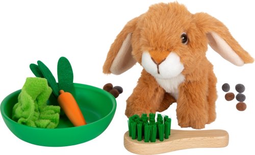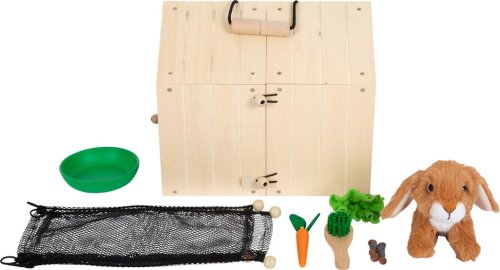 Roztomilý prístrešok av ňom ešte roztomilejší ňufáčik! Králikáreň zo stabilného dreva (ktorú možno použiť aj na prepravu) sa skladá z dvoch malých búdok, ktorý je možné za pomoci slučiek prepojiť. V jednej polovici môže plyšový králik nerušene spať a na druhej strane sa cez sieť môže rozhliadať po svojom okolí. K búdam je možné pripojiť dva pletivové ploty a vytvoriť tak vonkajší výbeh. Vďaka početnému príslušenstvu je výbeh pre králiky okamžite pripravený na hru a poskytuje realistické situácie pri hraní rolí. Pokiaľ deti ešte nemôžu mať skutočného maznáčika, potom je táto sada dokonalou alternatívou! Deti môžu totiž trénovať dôležité sociálne a emocionálne zručnosti pri predstieraní starostlivosti o zviera. Balenie obsahuje plyšového králika, metličku, misku, mrkvu z dreva a plsti, kúsok šalátu a pár plstených bobkov. Čiernu stenu na zadnej strane búdy je možné za pomoci kriedy popísať. Hlavné vlastnosti: deti sa učia niesť zodpovednosť za svojich miláčikov vrátane doplnkov a potrieb podporuje kreativitu