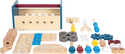 Robustná drevená súprava náradia v prepravke s rukoväťou. Praktická hračka 2 v 1, keď prepravku na náradie otočíte, môžete ju použiť ako pracovný stôl! Vďaka tejto vychytávke deťom hračka ponúkne nekonečné možnosti hrania, môžu sa hrať aj na cestách. V balení nájdete 3 ks náradia - kladivo, kľúč, skrutkovač a ďalšie bohaté príslušenstvo. Náradie môžete do prepravky jednoducho uložiť alebo namontovať vďaka jej otvorom. Vďaka tejto sade budú mať malí remeselníci svoje vybavenie vždy po ruke. Sada obsahuje: prepravka na náradie, kladivo, kľúč, skrutkovač, 7 skrutiek, 5 matíc, 2 veľké perforované doštičky, 2 malé perforované doštičky, 1 stredne veľká perforovaná doštička, 2 perforované doštičky v tvare diamantu, 2 obdĺžnikové perforované doštičky, 4 silné podložky , 4 tenké podložky, 2 ozubené kolesá. Hlavné vlastnosti: robustné a odolné prevedenie pônk a prepravka na náradie 2 v 13 drevené nástroje (kladivo, kľúč, skrutkovač) komplexné príslušenstvo vrátane skrutiek, matíc, ozubených kolies, sady podložiek a perforovaných dielov v rôznych tvaroch a veľkostiach množstvo herných možností na cestách trénuje jemnú motoriku a sústredenie rozvíja fantáziu a kreativitu skvele sa hodí k ostatným produktom radu Workshopkompatibilný s produktmi radu Nordic, Miniwob