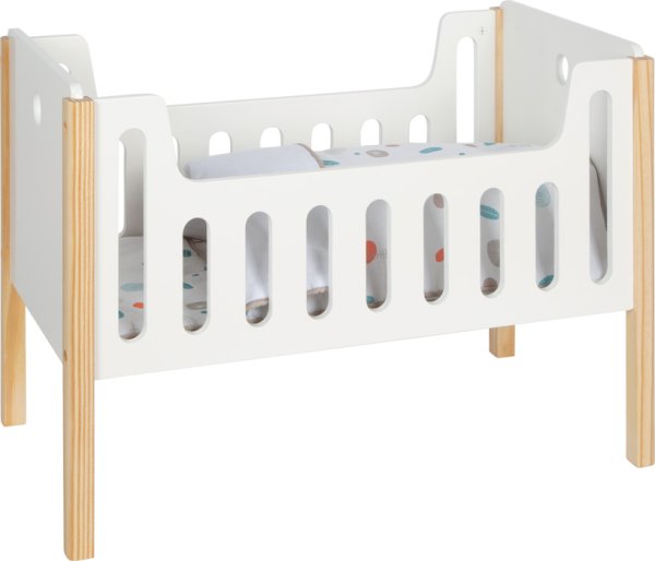 Táto moderná drevená postieľka pre bábiky v škandinávskom lineárnom dizajne je ideálnou postieľkou na uspávanie bábik alebo plyšákov. Má vysoko kvalitné spracovanie so zaoblenými hranami a viditeľnými prvkami z masívneho dreva. Súčasťou sú obojstranné obliečky s veľkou prikrývkou, ktoré umožňujú pohodlné spanie aj väčším bábikám alebo plyšovým hračkám do veľkosti 46 cm. Zvýšená plocha na ležanie pre bábiky umožňuje ergonomickú hru. Vďaka decentnému dizajnu z neutrálnej bielej v kombinácii s prírodným drevom sa táto stabilná postieľka skvele hodí do každého interiéru obývačky alebo detskej izby. Hlavné vlastnosti: séria nábytku pre bábiky „Little Button“ obojstranné posteľné obliečky do veľkosti bábik 46 cm