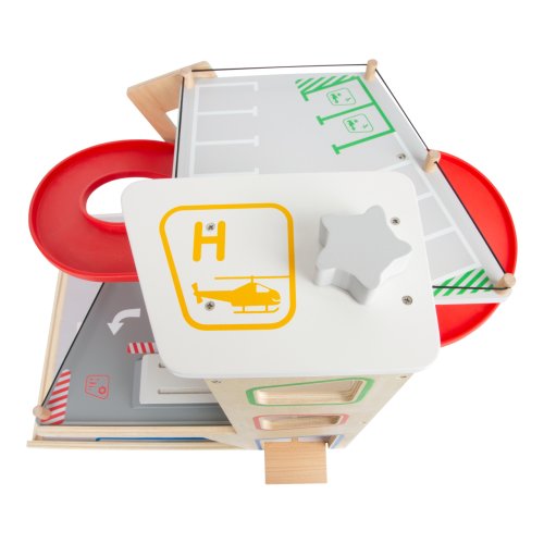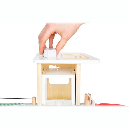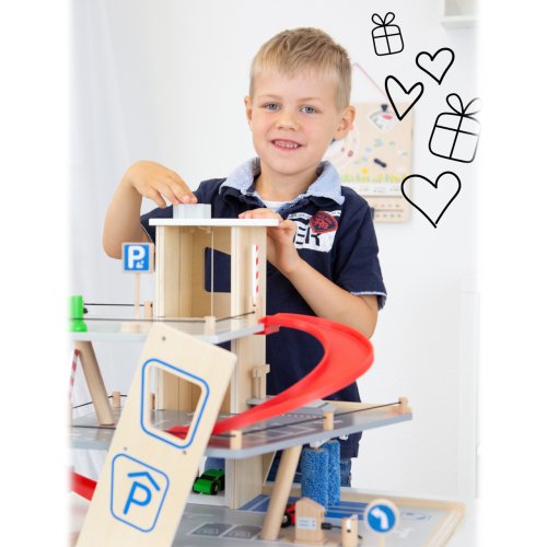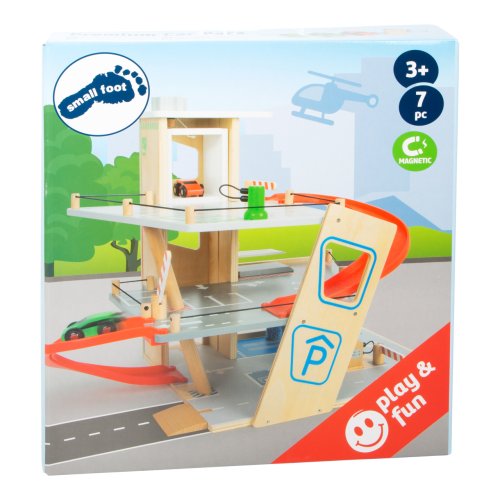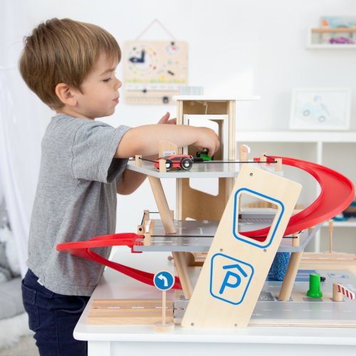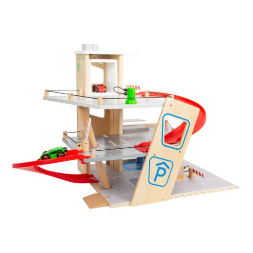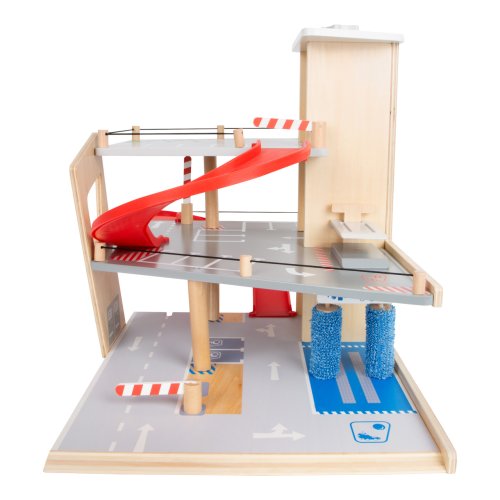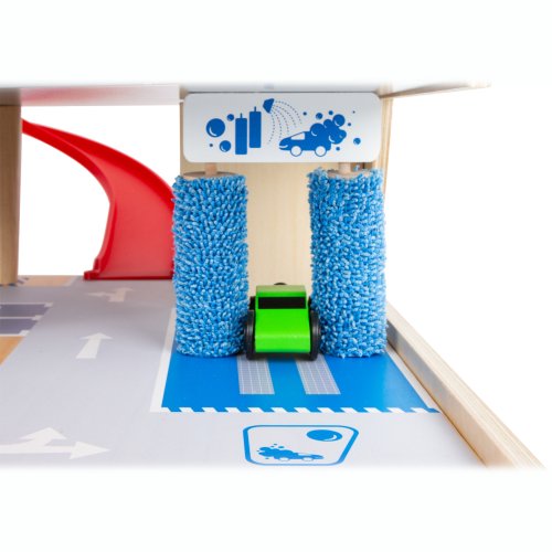 Parkujte, tankujte, umývajte alebo opravujte, a to všetko s jednou garážou! Ponúka tri bohato vybavené podlažia prepojené atraktívnym funkčným výťahom a zábavnými, na seba plynule nadväzujúcimi rampami. Jej súčasťou je dvojica autíčok, ktoré môžu pri fantastických hrách využiť pumpy, nabíjacie stanice, zdvíhacie rampy alebo umývačky s realistickými kefami. Každá z úrovní je navyše vybavená mechanickou závorou pre dokonale pútavé zážitky. Poschodia sú opatrené gumovým hradením, ktoré dodávajú jazde autíčok na dynamike a bránia ich vypadnutiu. Garáž je podrobne zdobená mnohými farebnými ikonami a značením, ktoré do hier vnesie aj poučenie. Je vyrobená zo silnej, pevnej a odolnej drevenej preglejky s doplnkami z masívneho dreva a nezávadného plastu. Výrobok vyžaduje montáž, dodávané s obrázkovým návodom na zostavenie. Hlavné vlastnosti: garáž a 2 autíčka3 podlažia prepojené funkčným výťahom a 2 rampamipumpa, nabíjacia stanica, zdvíhacia rampa, umývačka a 3 závorykompatibilné s vláčikodráhami a súvisiacim príslušenstvom iných výrobcovbohato zdobené jednoduchými ikonami a značenímpevné a odolné drevené prevedenie