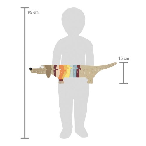 Kto môže pomôcť tomuto roztomilému jazvečíkovi ABC poskladať sa? Vďaka 26 extra veľkým, masívnym dielikom puzzle je tento dlhý psík v pruhovanom svetri obzvlášť vhodný pre deti. Všetky prvky puzzle sú vyrobené z hladkého dreva a sú ľahko uchopiteľné na detské ruky. Je to ideálna logická hra pre malých začiatočníkov, ktorá stimuluje všetky zmysly a ponúka dvojitý efekt učenia, pretože jazvečík získa správnu formu iba vtedy, keď je abeceda zostavená v správnom poradí. Puzzle ABC je vhodné pre deti (pred) školského veku. Kam sa, ktorý kus hodí? Do ktorého otvoru diel presne patrí? V tejto logickej hre existuje iba jedno riešenie, ktoré možno nájsť tak, že to budete robiť kúsok po kúsku. Vďaka svojmu modernému vzhľadu je toto krásne veľké drevené puzzle tiež roztomilé aj ako dekorácia do detskej izby, alebo š kôlky. Hlavné vlastnosti: obsahuje 26 dielikovrozvíja jemnú motoriku a logické myslenievyrobené z vysoko kvalitných, zodpovedne získaných materiálovideálna výuková logická hra pre deti (pred)školského veku