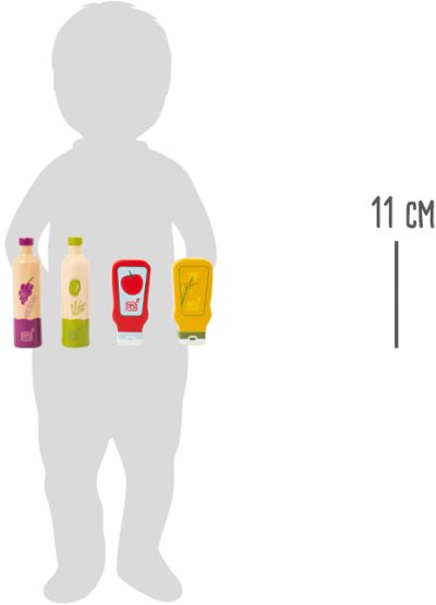 To správne korenie do detskej kuchynky! Herný set obsahuje fľaštičky z kvalitného dreva v typických farbách daného produktu. Vďaka výrazným ilustráciám na fľaši dieťa ich obsah ľahko rozpozná. Set obsahuje ocot, olej, kečup a horčicu. Hlavné vlastnosti: sada obsahuje 4kspodporuje predstavivosť a hranie rolí