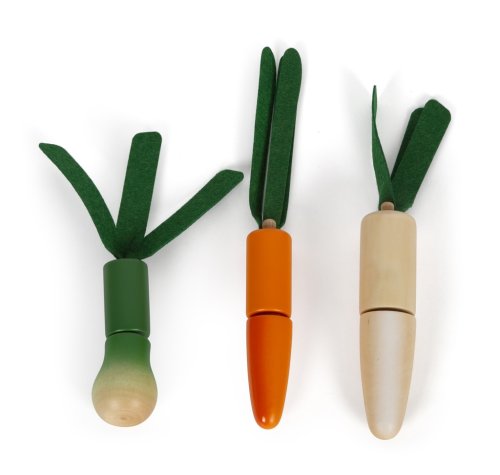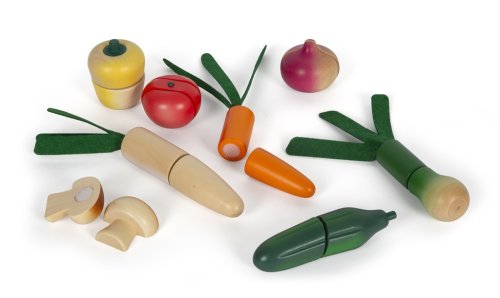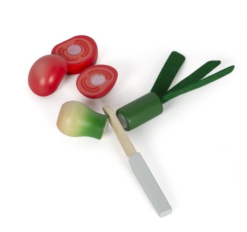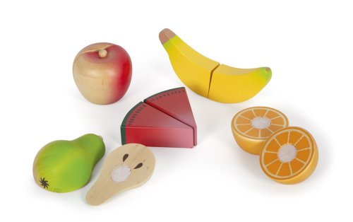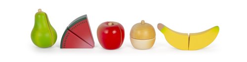 Táto veľká sada potravín v praktickej debničke je nielen nevyhnutným doplnkom každej kuchynky, ale taktiež naučí deti rozpoznať základné druhy ovocia a zeleniny a ďalších potravín. Na výrobu bolo použité robustné drevo a všetko je realisticky spracované. Potraviny sú spojené suchým zipsom a deti ich môžu ľahko „rozkrojiť“ pomocou priloženého noža. Sada obsahuje drevený nôž, paradajku, uhoriek, mrkvu, jablko, banán, hríbik, papriku, cibuľu, pór, pomaranč, melón, hrušku, reďkev (pastinák). Opakovane použiteľný obal učia deti zábavnou formou zodpovednosti k životnému prostrediu – obmedziť odpadky a plytvanie, znovu veci použiť, recyklovať. Hlavné vlastnosti: vhodné do detskej kuchynky vďaka suchým zipsom možno potraviny „nakrájať“ učia deti zodpovednosti k životnému prostrediu podporuje kreatívne a nápadité hranie