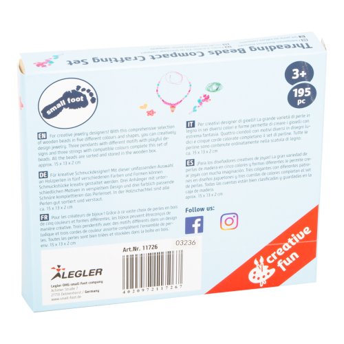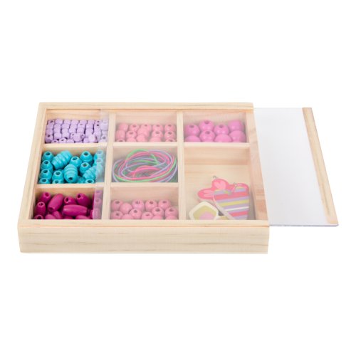 Vyrobte si svoje šperky s touto sadou korálikov v piatich rôznych farbách a tvaroch. Korálkový set dopĺňajú tri prívesky s rôznymi motívmi v hravom dizajne a tri farebne zladené šnúry. Všetko je uložené v drevenej krabici. Navliekaním korálikov je podporovaná jemná motorika detí. Hlavné vlastnosti: päť rôznych farieb a tvarov podporuje jemnú motoriku