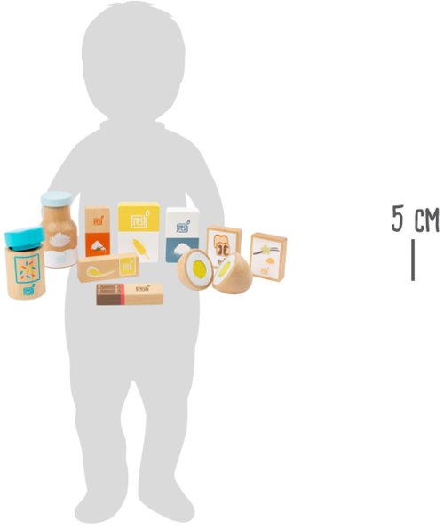 Pozor, všetci pekári a cukrári! Táto 10dielna sada drevených ingrediencií na pečenie ponúka všetko, čo si srdce mladých pekárov žiada. Okrem múky tu nájdete cukor, smotanu, soľ a prášok do pečiva, balenie vanilkového cukru a rozložiteľné vajíčko. To je to najdôležitejšie na pečenie v domácej kuchynke. Hotový produkt posypeme čokoládou a zdobením a môžeme podávať! Hlavné vlastnosti: obsahuje 10 ingrediencií podporuje hranie rolí a učí o jedle v domácnostirozvíja motoriku detí