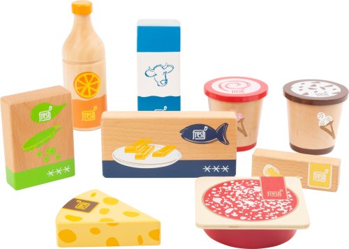 Týždenný nákup potravín bude vďaka tomuto setu rýchlovka! Nájdete tu pomarančový džús, dve balenia zmrzliny, balenie hrášku, rybie prsty, maslo, syr, krájanú salámu a škatuľu mlieka. 9 dielna súprava vám jednoducho splní všetky priania! Deti sa so sadou naozaj vyhrajú. Najprv "nakúpi" a potom uloží potraviny do svojej detskej kuchyne alebo predajného stánku. Hračka disponuje prírodným dizajnom v spojení s elegantnými ilustráciami a je vyrobená z pevného dreva (teda sľubuje dlhotrvajúcu kvalitu). Hlavné vlastnosti: vhodné ako doplnok kuchynky, obchodu, či stánku podporuje hranie rolí a kreativitu