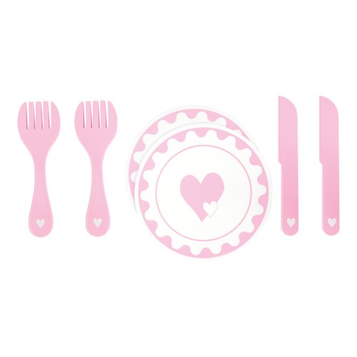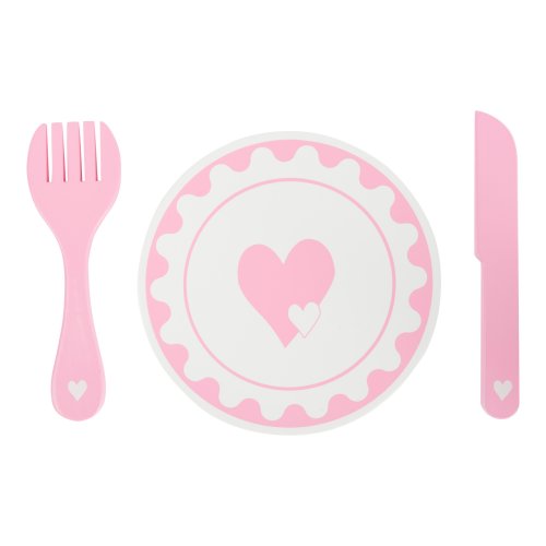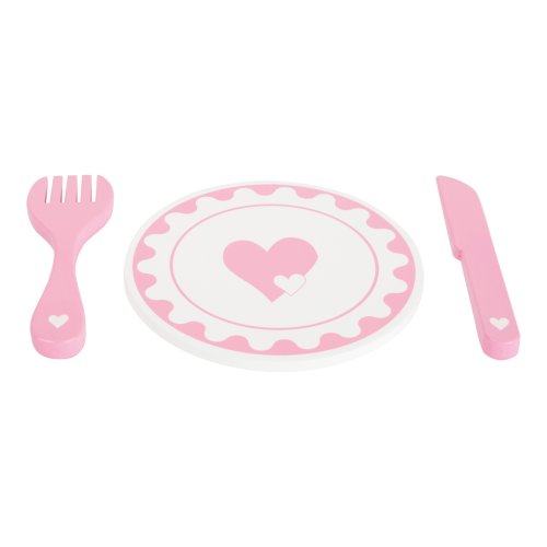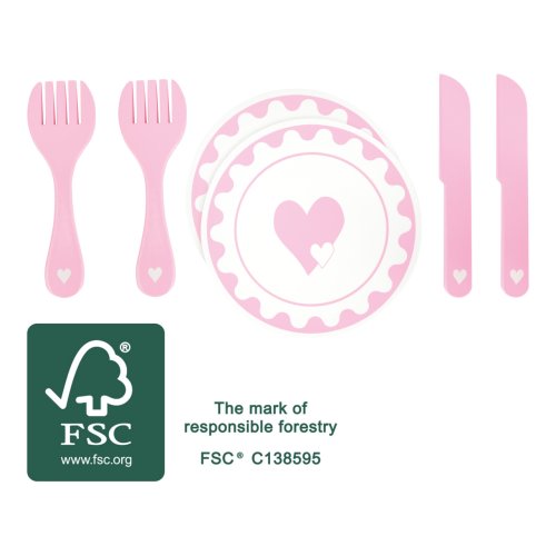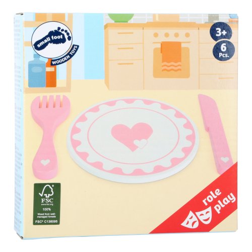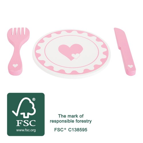 Rozprávkové prestieranie! Jedlo z detskej kuchynky bude vďaka týmto tanierom chutiť ešte lepšie a deti sa pri hre môžu naučiť správnemu stolovaniu. Malý drevený servis je dekorovaný srdiečkami. Vyrobené zo 100% certifikovaného FSC® dreva . Hlavné vlastnosti: 2 taniere, 2 vidličky a 2 nože rozvíja jemnú motoriku detí podporuje zvedavosť vyrobenú z 100% FSC dreva. šetrným či prírode blízkym spôsobom, v ktorom sú dodržiavané prísne environmentálne a sociálne požiadavky. Značka FSC® na výrobku znamená, že svojim nákupom pomáhate chrániť lesy a podporujete šetrné, zodpovedné či prírode blízke hospodárenie, vďaka ktorému sú naše lesy stabilnejšie, zdravšie, majú prirodzenú druhovú skladbu a lepšie odolávajú negatívnym následkom klimatických zmien.