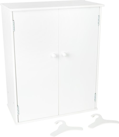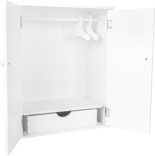 Organizácia je polovica úspechu! Táto šatníková skriňa pre bábiky v jednoduchom dizajne zaujme zákazníkov svojou pohodlnou konfiguráciou. Malým deťom umožňuje hravo udržať vo všetkom poriadok. Oblečenie bábik je možné zavesiť na integrované ramienka alebo položiť na police. Výsuvná zásuvka ponúka aj priestor pre vybrané veci pre bábiky. Hlavné vlastnosti: všetky ich obľúbené outfity bábik sú na jednom miestepraktický doplnok sady nábytku pre bábiky súčasťou sú dve ramienka na šaty