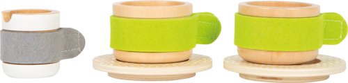 Všetci priatelia čaju a milovníci kávy pozor. Táto sada bola navrhnutá s ohľadom na najmenších hostiteľov, ktorí radi imitujú dospelých pri príprave kávy a čaju. Súprava má krásny dizajn, zaujímavé detaily, vysoké množstvo drevených materiálov a hapticky príjemné plstené kúsky. Dve šálky s podšálkami, dve lyžičky, cukornička, kanvička na mlieko a veľká kanvica na kávu/čaj sú doplnené tanierom a sendvičovými sušienkami. Na cukorenke a kanvici na kávu/čaj je odnímateľné veko pre ešte väčšiu realistickú hru. Podporuje rozvoj predstavivosti a sociálnych zručností. Hlavné vlastnosti: podporuje kreativitu a sociálne zručnostivyrobené z dreva a plstených doplnkovskvelý doplnok do detskej kuchynkyhapticky príjemné plstené kúsky